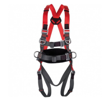 A basic full body fall arrest and work positioning harness with 5 attachment points: 2 front, 1 back, 2 side. Integrated padded positioning belt. Steel components. One size fits all. Made outside of the US.